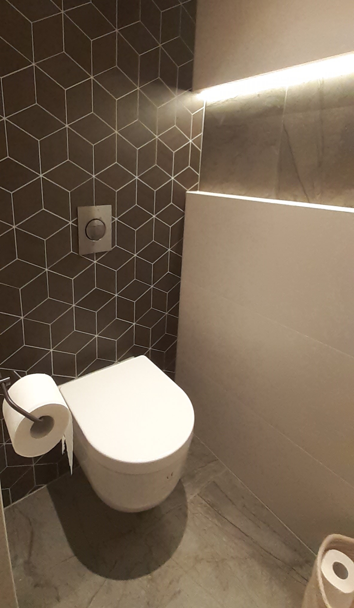In deze badkamer is er gebruik gemaakt van verschillende tegel en sanitair merken.