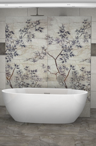 In deze badkamer is er met behulp van een T-opstelling (zie plattegrond onderaan) een muurtje gecreëerd waartegen we dit prachtige half-vrijstaande bad van Lavigo gemonteerd hebben. Dit bad is geplaatst tegen dit hele mooie decor van Fanal, uit de serie Essence, genaamd Autum Ivory. Deze tegels hebben een maatvoering van 45 x 118 cm. De vloertegel van deze badkamer is tevens van Fanal uit de serie Essence, hier te zien in de kleur Smoke en de afmeting 75 x 75 cm. Boven het bad is een inbouw badcombinatie van Grohe, uit de serie Smartcontrol geplaatst, in de kleur hard graphite geborsteld.