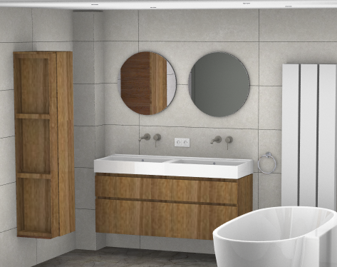 Aan de andere zijde van de badkamer hangt het badkamer meubel, welke afkomstig is van Primabad. Het badkamer meubel bestaat uit een onderkast van 140 cm breed, met 2 asymmetrische lades, hierop ligt een keramisch wastafelblad. Hiernaast, aan de andere muur, is een hoge kast gemonteerd van 45 cm breed, met een deel gesloten kast, en een deel open kast. Deze meubels zijn in de kleur cognac brown. Boven het badkamermeubel zijn twee spiegels met indirecte verlichting gemonteerd van H&R badmeubelen, de diameter van deze spiegels is 60 cm. Boven het badmeubel zijn twee inbouw wastafelkranen gemonteerd van het merk Grohe uit de serie Essence, weer in de kleur hard graphite geborsteld.