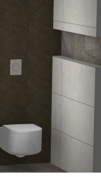 Aan de achterzijde van de T-opstelling zit aan de ene kant het toilet, en aan de andere kant de douche. Hier zien we nog andere tegels terugkomen, op de achterwanden zit namelijk een tegel verwerkt van Atlas Concorde uit de serie Mek, in de kleur bronze. Deze hexagonnetjes hebben een afmeting van 30 x 35 cm per matje. De wandtegel die hier te zien is, is afkomstig van Colorker, uit de serie Privelige in de kleur moon, deze tegel heeft een afmeting van 39,6 x 118,2 cm. In de nis met daarin ook ledverlichting verwerkt, is op de achterkant een tegel van Fanal, tevens uit de serie Essence, maar hier in de kleur Ivory verwerkt, deze heeft een maatvoering 45 x 118 cm.