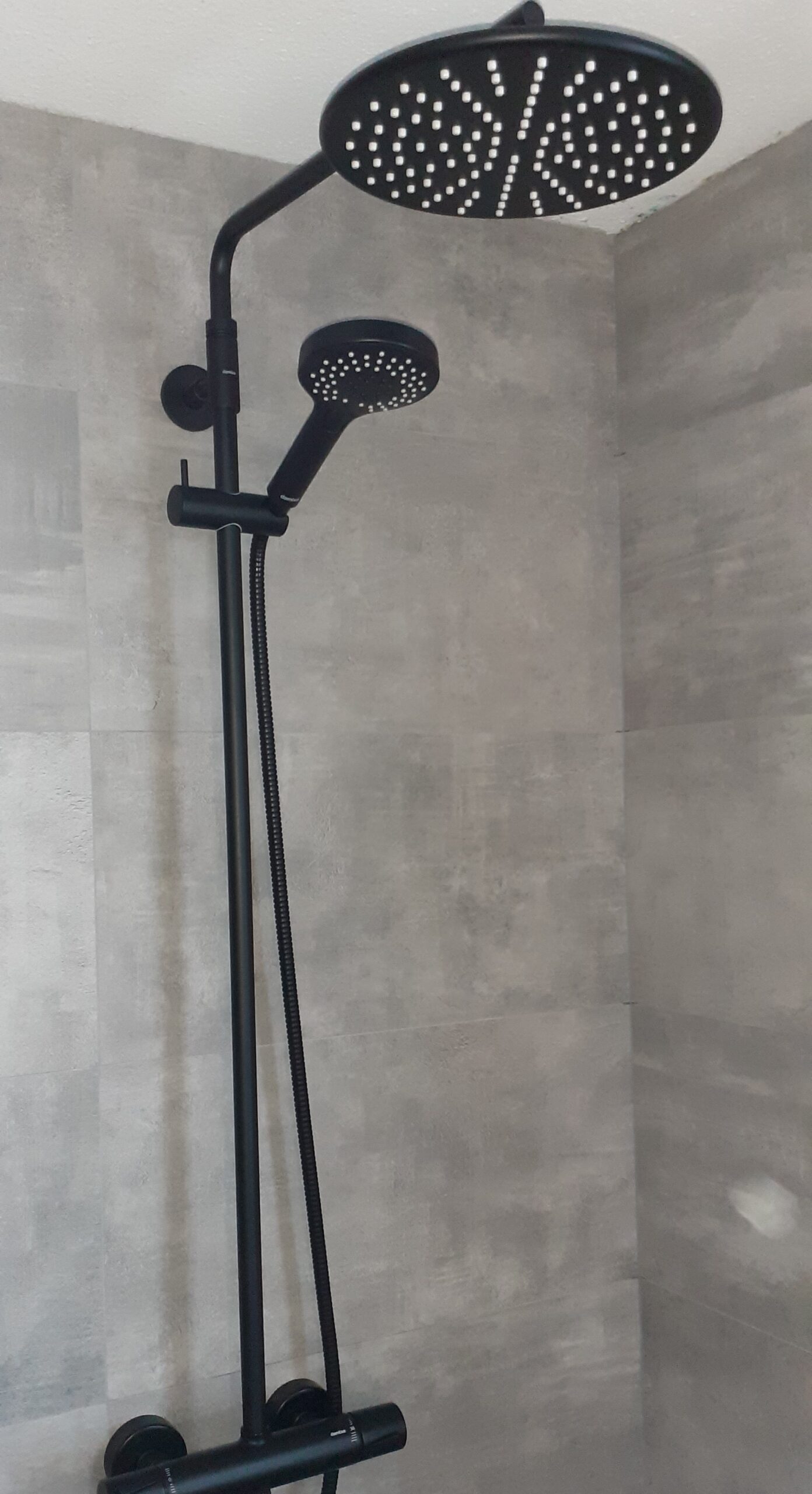 In deze badkamer is er een douchevloer geplaatst van Ideal Standard uit de serie Ultra Flat in de maatvoering 100 x 90 cm. Deze douchevloer is hier geplaatst in de kleur zwart, en past daarmee perfect bij de douchecabine, welke ook mat zwart is. De douchecabine is afkomstig van Xenz, en komt uit de serie Industrial Line Premium. Verder hangt hier tevens een mat zwarte opbouw doucheset van Damixa, met een mooie regendouche van 25 cm in de diameter.