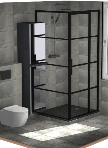 Deze badkamer was aan de kleine kant (zie plattegrond onderaan de pagina), en daarom is er voor gekozen om de hoge kast en de radiator samen te integreren. Hier heeft Sanijura de oplossing voor, zij hebben namelijk een hoge kolomkast welke een spiegelende deur heeft, welke warmte afgeeft door een geïntegreerde verwarming. Dit is dus een ideale oplossing wanneer er geen ruimte is voor deze beide onderdelen apart.
