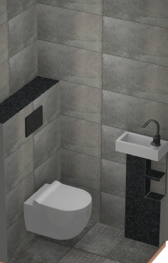 In dit losse toilet zijn dezelfde tegels verwerkt als op de badkamer. Het natuursteen (Basalt) is verwerkt boven op het inbouwreservoir en als dorpel. Tevens is dit natuursteen ook verwerkt in de badkamer, als dorpel, vensterbank, en ook bovenop het inbouwreservoir.