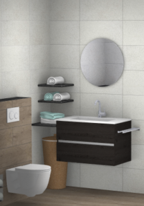 In deze badkamer is er gebruik gemaakt van een meubel van H&R Badmeubelen in de kleur Lariks Antraciet, met breedte 80 cm. Hierboven is een ronde spiegel gemonteerd, tevens van H&R Badmeubelen, in een afmeting van 60 cm. Deze spiegel beschikt over indirecte verlichting en spiegelverwarming. Hierbij is een wastafelkraan met een u-uitloop gemonteerd van Korver.