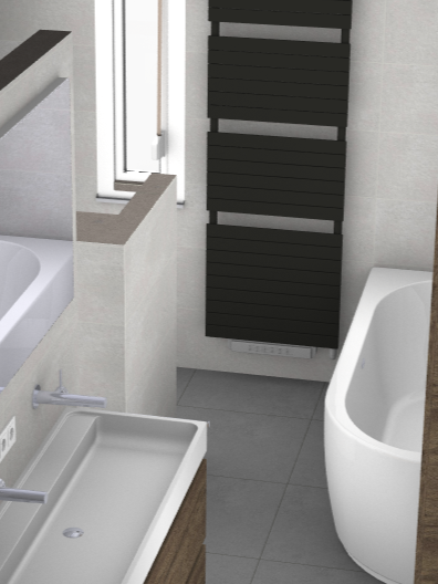 Naast het bad is een elektrische radiator van het merk Vasco geplaatst, welke afkomstig is uit de serie Aster. Deze heeft de afmeting 60 x 180,5 cm en is hier uitgevoerd in de kleur Grey Anthracite.
