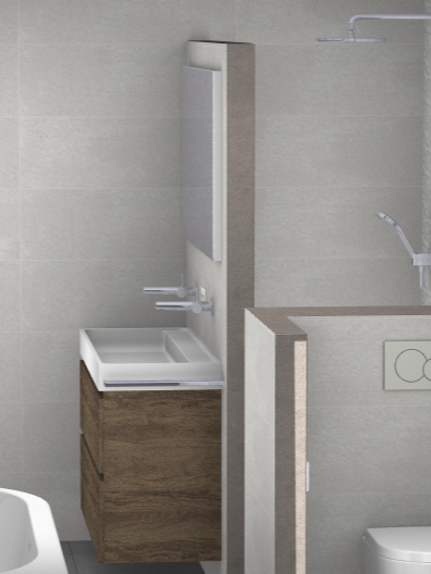 De tegels die verwerkt zijn in deze ruimte zijn afkomstig van Colorker, en komen alle uit de serie Backstage. Op de wand is de kleur Moon verwerkt in de afmeting 29,5 x 90 cm. In de douche is in deze zelfde kleur en afmeting een decor geplaatst van deze serie. Op de vloer ziet u de kleur Grey, in de maatvoering 59,5 x 59,5 cm. Dit is verder afgewerkt met Basalt.