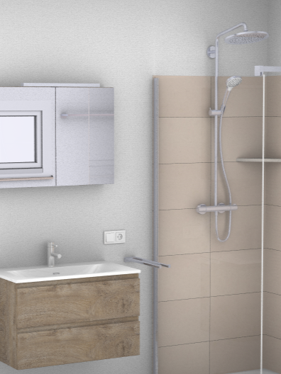 Bij de douche is een nisje gecreëerd voor shampoo etc. De douche is uitgevoerd met een douchevloer van Laufen uit de serie Pro, en is hier te zien in de maat 90 x 120 cm, in de kleur Wit. Verder is de inloop douchewand afkomstig van Van Rijn Products, uit de serie ST01 met een lengte van 120 cm. De doucheset die hier gemonteerd is, is afkomstig van Hansgrohe, deze uit de serie Croma.