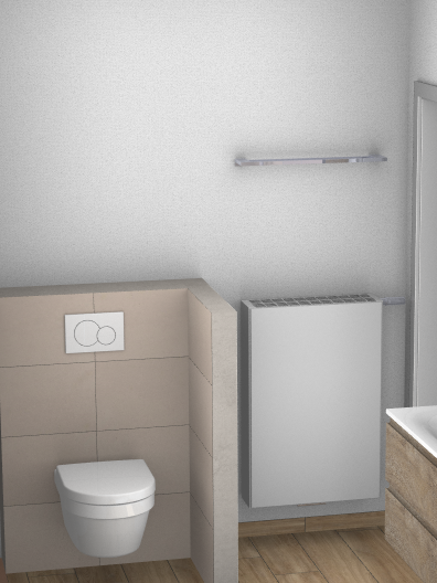 Aan de andere zijde van de badkamer is het toilet geplaatst. Hier is een muurtje naast geplaatst, om zo privacy te creëren, aangezien het toilet anders recht in het zicht stond bij binnenkomst. Dit toilet is afkomstig van Villeroy & Boch, uit de serie O.Novo.