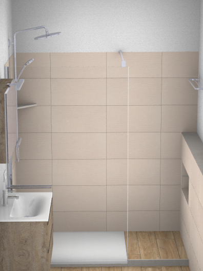 De klanten van deze badkamer hadden de wens voor een rustige, strakke badkamer. Daarom is er voor gekozen om de tinten van de badkamer licht te houden. Verder is er voor een deel in de badkamer getegeld (maatvoering 30 x 60 cm), en voor een deel gestuct, dit brengt ook rust met zich mee, doordat er minder voegen zijn.