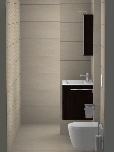 Op de lange wand is de decortegel met wave effect verwerkt, deze heeft als benaming Concept Beige. Op de vloer is deze zelfde kleur, Beige, verwerkt in 75 x 75 cm. Op de rest van de wanden is dezelfde kleur tegel in 30 x 90 cm verwerkt.