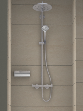 De douchegoot die in de douche geplaatst is, is afkomstig van Aco Showerdrain. Hierbij is een doucheset geplaatst van Hansgrohe, uit de serie Croma. Daarnaast is een sponskorf van Keuco geplaatst met geïntegreerde wisser.