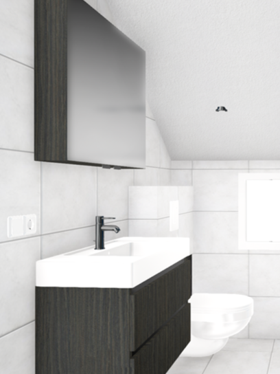 Deze klant kwam bij ons met de vraag een functionele indeling te maken in zijn kleine badkamer. Hierbij hebben we de volgende opstelling bedacht, zie voor de plattegrond het einde van deze pagina. Het badkamermeubel en het toilet zijn naast elkaar geplaatst. Het badkamermeubel is afkomstig van Dansani, uit de serie Capella, hier te zien in de kleur Terra Grijs. Het meubel is 80 cm breed, en heeft voor extra opslagruimte een spiegelkast erboven hangen. Verder is er nog extra opslagruimte gecreëerd door een half hoge kast te plaatsen achter het douchemuurtje (wederom, zie de plattegrond). Op het wastafelmeubel is de elegante kraan van Hansgrohe uit de Talis serie geplaatst met een mooie C-uitloop.